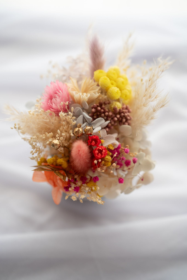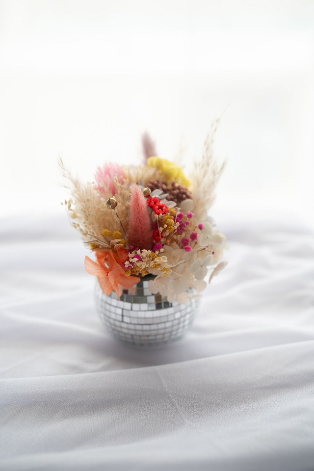 Une petite touche de lumière pour votre intérieur ! Ce vase boule à facettes argenté accueille une composition délicate de 13 cm de hauteur et 10 cm de diamètre. Réalisée avec des fleurs séchées et stabilisées dans les tons doux et naturels, cette création originale ne demande aucun entretien. Parfaite pour apporter une note festive et poétique à votre décoration pendant plusieurs années.