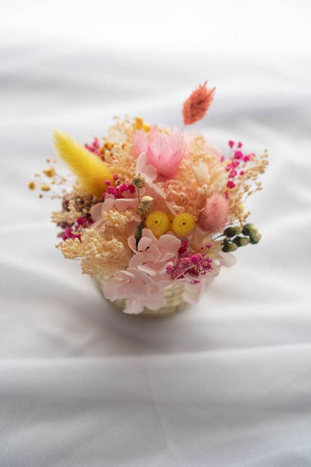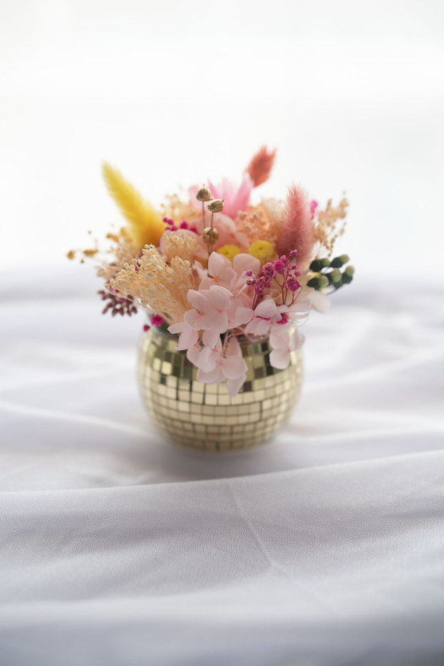 Une petite touche de lumière pour votre intérieur ! Ce vase boule à facettes doré accueille une composition délicate de 13 cm de hauteur et 10 cm de diamètre. Réalisée avec des fleurs séchées et stabilisées dans des tons doux et naturels, cette création originale ne demande aucun entretien. Parfaite pour apporter une note festive et poétique à votre décoration pendant plusieurs années.