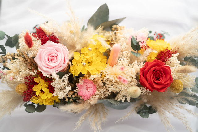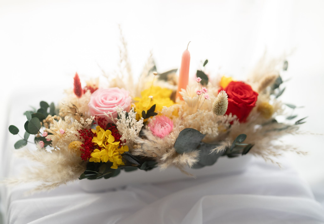 Magnifique centre de table artisanale de 40 cm. Composition réalisée avec des roses et du feuillage stabilisés (conservent leur souplesse et leur couleur pendant plusieurs années sans eau) ainsi que les fleurs séchées. Une création durable pour une décoration raffinée.