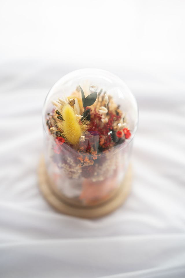 Élégante composition d’intérieur de 19 cm de hauteur et 10 cm de diamètre (contenant et fleurs compris). Réalisée avec des fleurs stabilisées et séchées, cette création sous cloche conserve sa beauté pendant plusieurs années sans aucun entretien et protège délicatement les fleurs de la poussière pour un éclat durable.