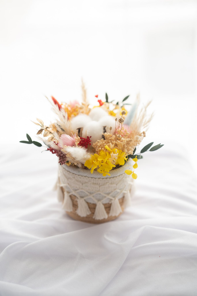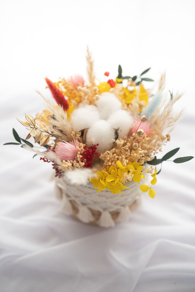 Composition d’intérieur de 18 cm de hauteur et 16 cm de diamètre (contenant et fleurs compris). Réalisée avec des fleurs stabilisées et séchées, cette panière apporte une touche champêtre et durable à votre intérieur. Elle conserve son éclat pendant plusieurs années sans aucun entretien.
