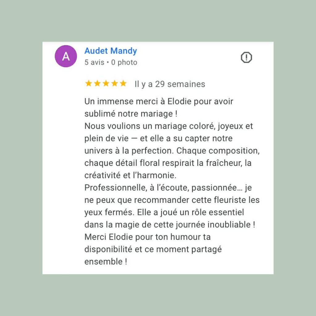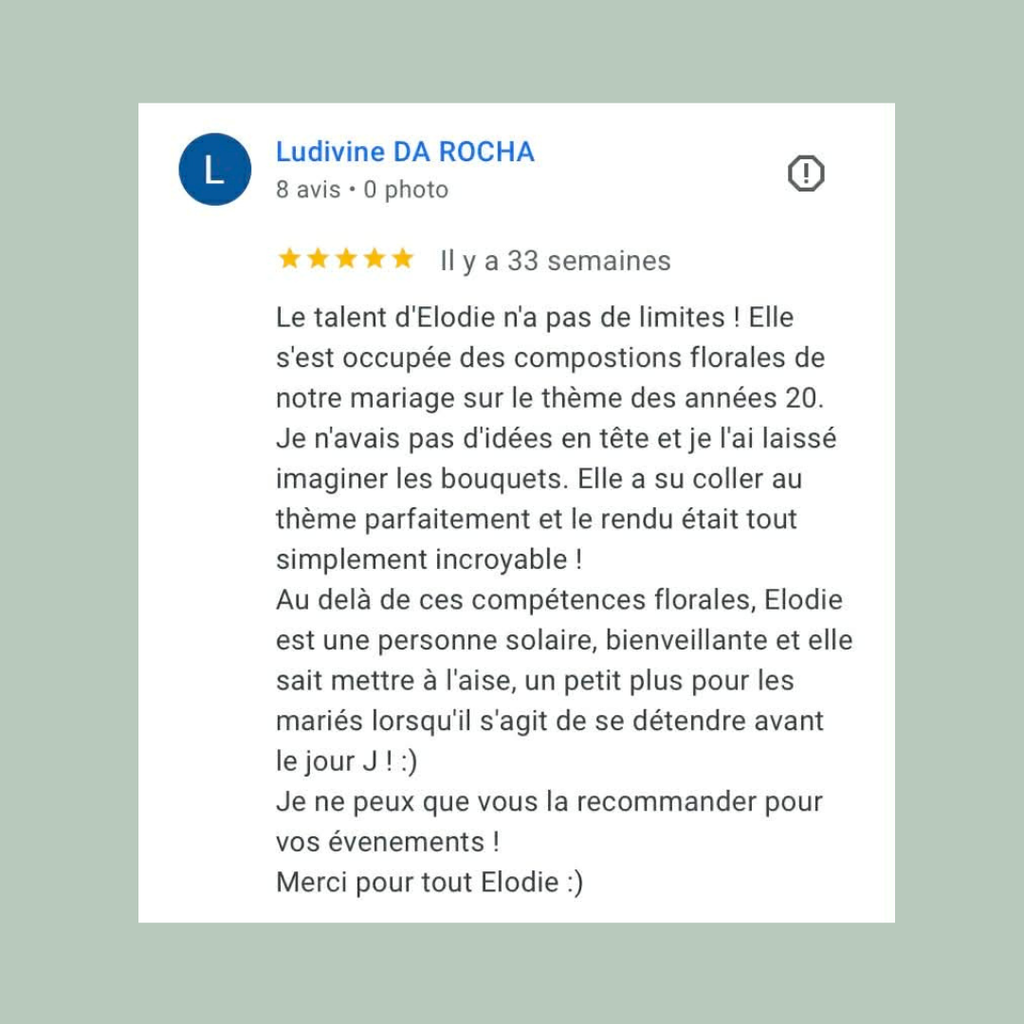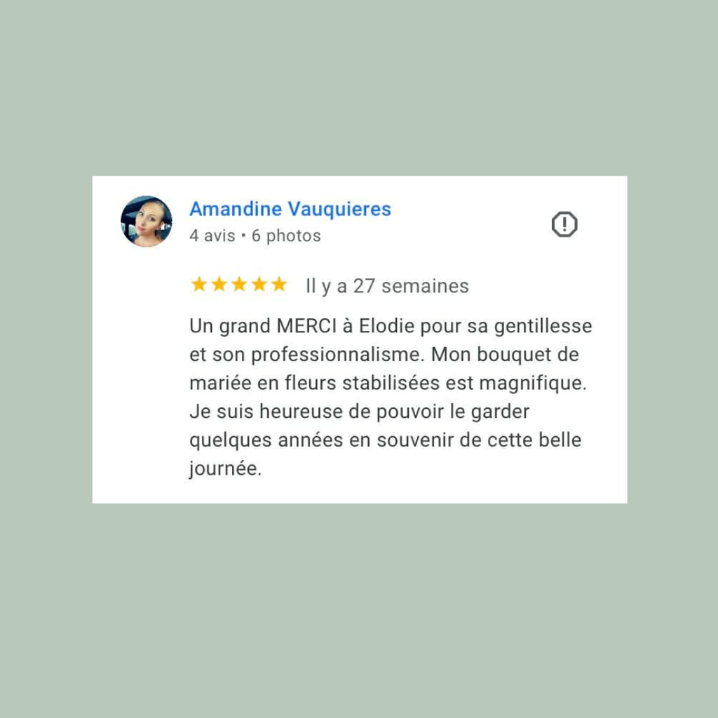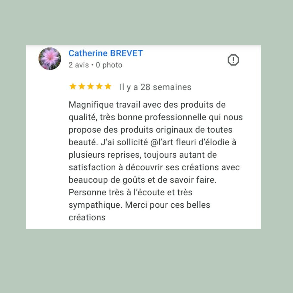 Qu’il s’agisse d’une création pour votre intérieur ou de la décoration de votre mariage, je mets tout mon cœur dans mon travail. Retrouvez ici vos témoignages récoltés sur Google. Merci de faire grandir ma passion !